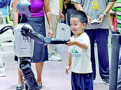2025年服贸会主题展上,一名小观众与机器人互动。新华社发