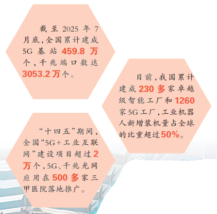 截至今年7月底,全国累计建成5G基站459.8万个,千兆端口数达3053.2万个,实现“县县通千兆、乡乡通5G、村村通宽带”。