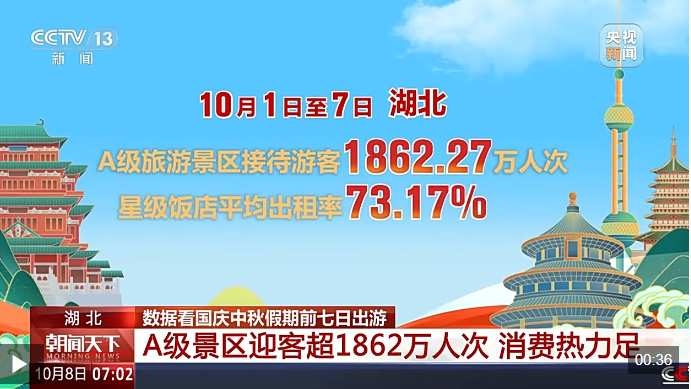 湖北省文化和旅游厅统计数据显示,截至7日,假期前七天,湖北A级旅游景区接待游客1862.27万人次,星级饭店平均出租率73.17%。双节期间,湖北文旅部门联合重点零售企业投放1亿元消费券,游客只需凭目的地为湖北的火车票、演出票等票据票根,便能兑换“吃住行游购娱”多场景的丰富权益。