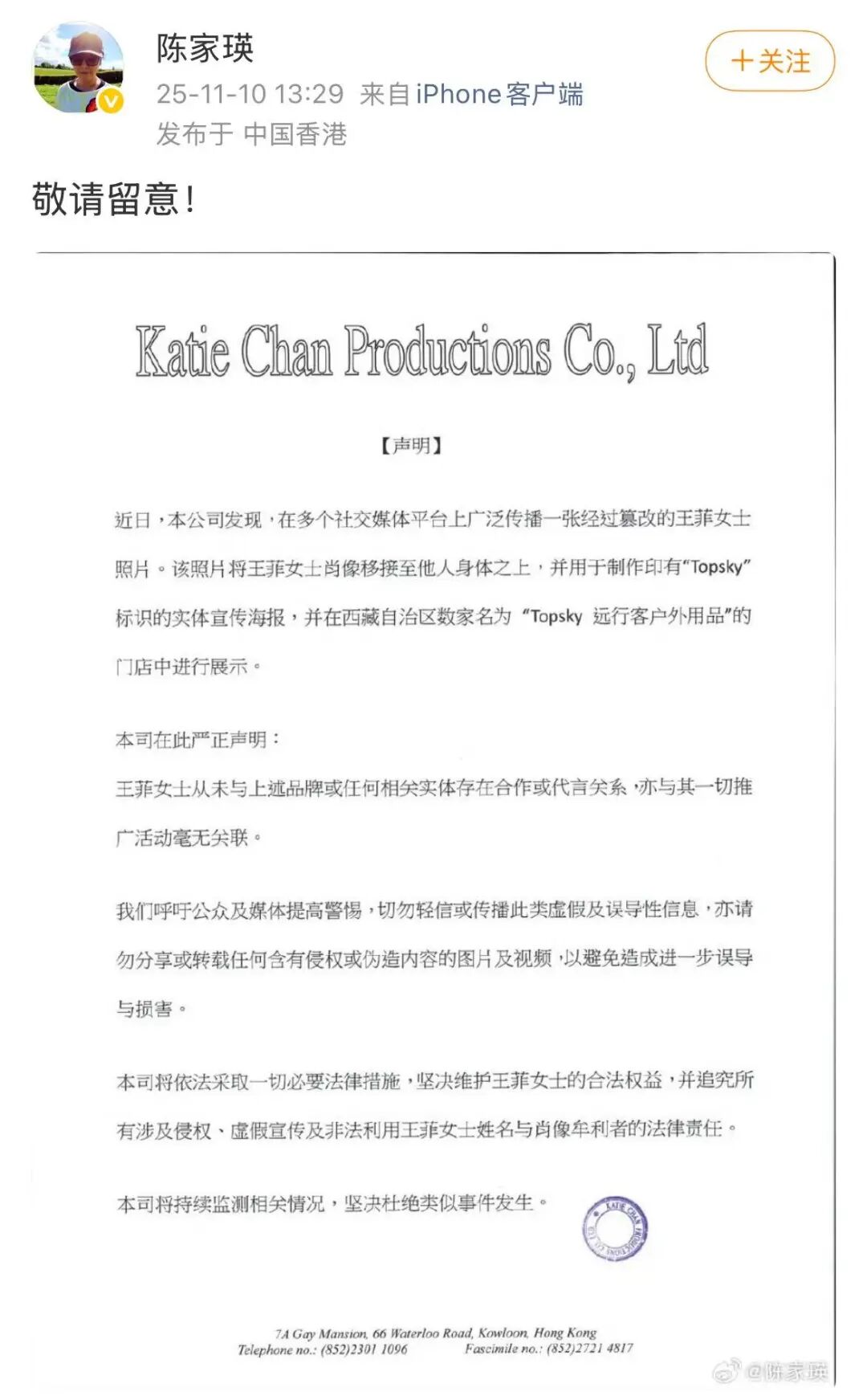 11月10日,王菲经纪人@陈家瑛 发布声明称某户外品牌伪造王菲代言海报,将采取法律手段追责。