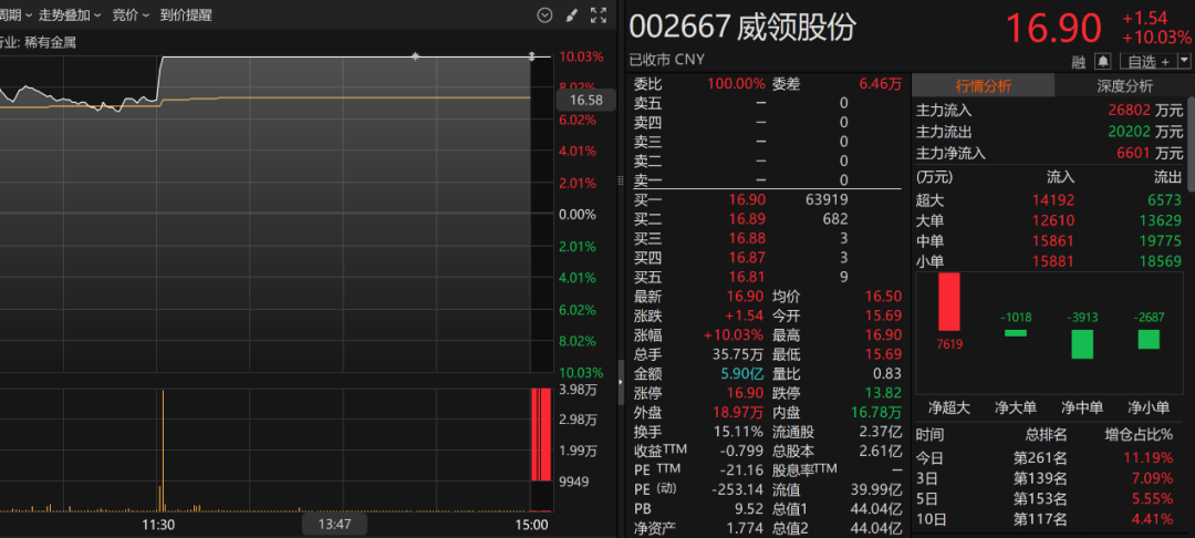 值得注意的是,威领股份股价在11月24日高开高走,并在午后突然直线拉升涨停,总市值报44.04亿元。