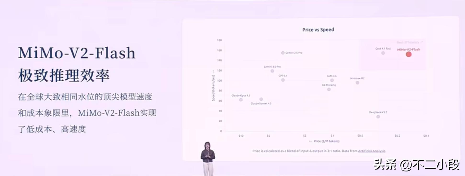 在全球顶尖模型的速度与成本象限图里,MiMo-V2-Flash处在右上角的“低成本、高速度”区间。