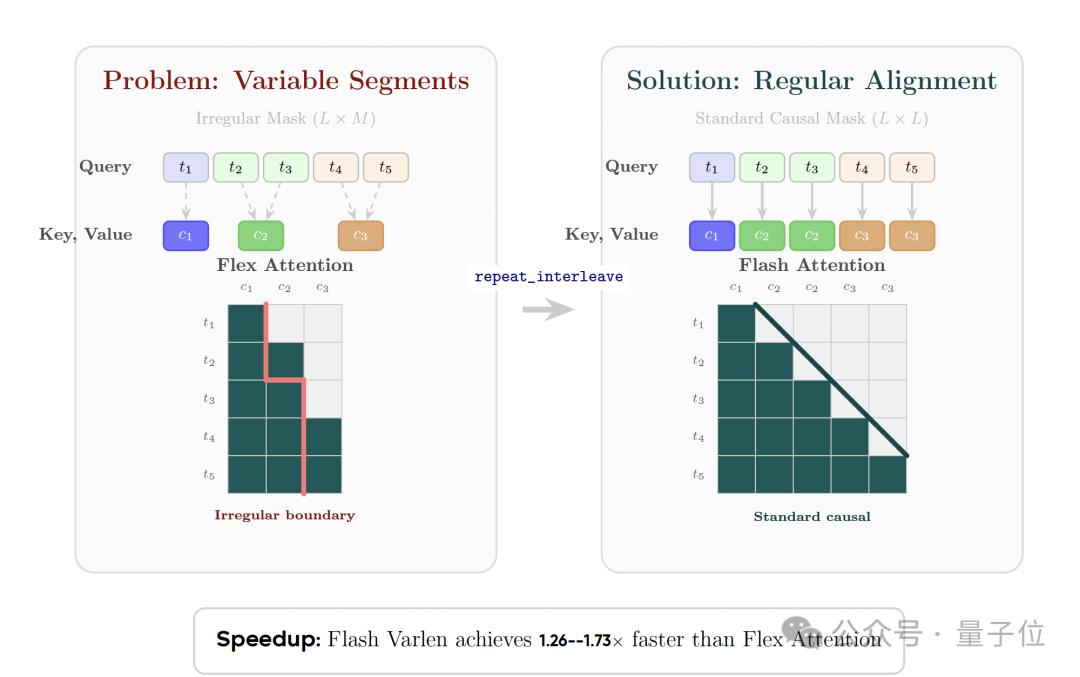 由此,研究将复杂的可变长交叉注意力问题转换为长度对齐、局部恒定的注意力问题,并使其能够利用高度优化的Flash Attention Varlen内核,获得了1.26倍到1.73倍的显著加速。