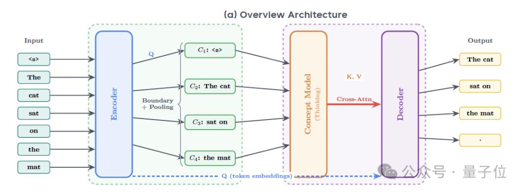 然后,在概念级推理阶段,模型将上面得到的概念序列在压缩空间中进行深度的、高容量的推理,得到经过深度推理和信息整合后的概念表示。