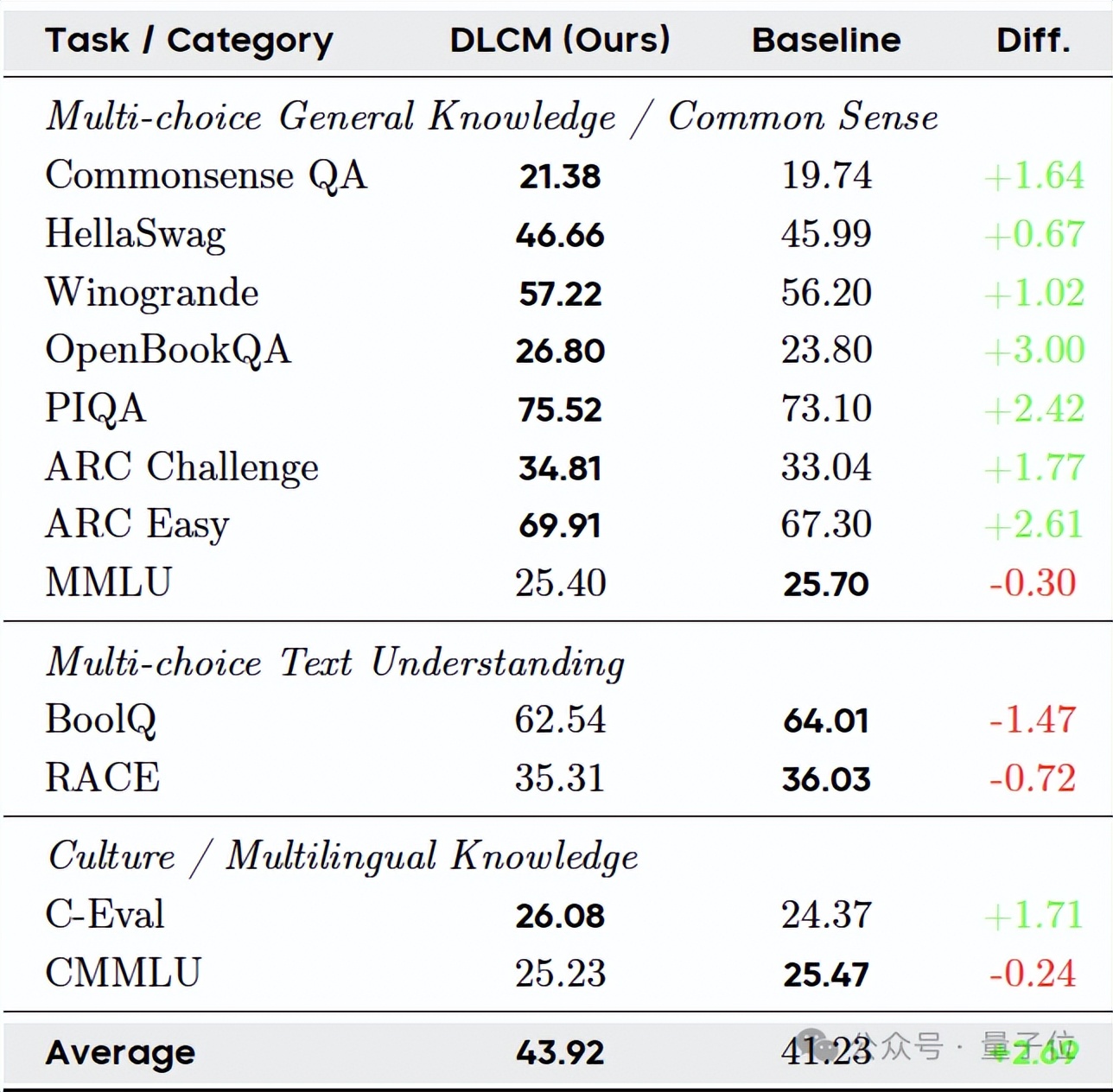 其中,DLCM实现了43.92%的平均准确率,超过了基线模型41.23%的分数,提升了2.69%。