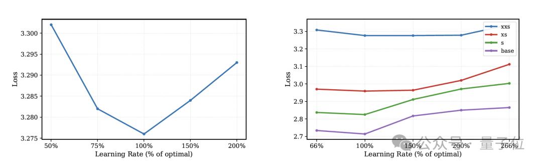 由此,研究成功地稳定了这种不等宽架构的训练,并实现了零样本超参数迁移,即小型代理模型上找到的最佳学习率可以直接用于训练更大的DLCM模型。