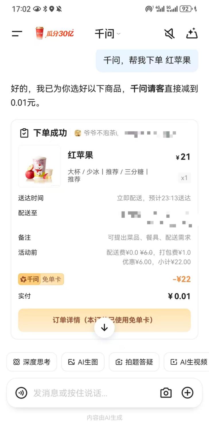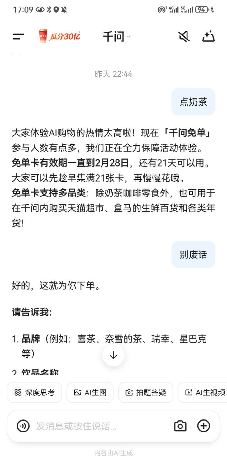 2月7日晚10点,在某大排档里,几个年轻人想喝点什么,看到对面有一个爷爷不泡茶,于是提议参加千问的免单活动。其中一位第一次下载千问,对着手机第n次点击确认“帮我点”,依然无法履约。无奈之下,只能从店里拿了一瓶可乐。