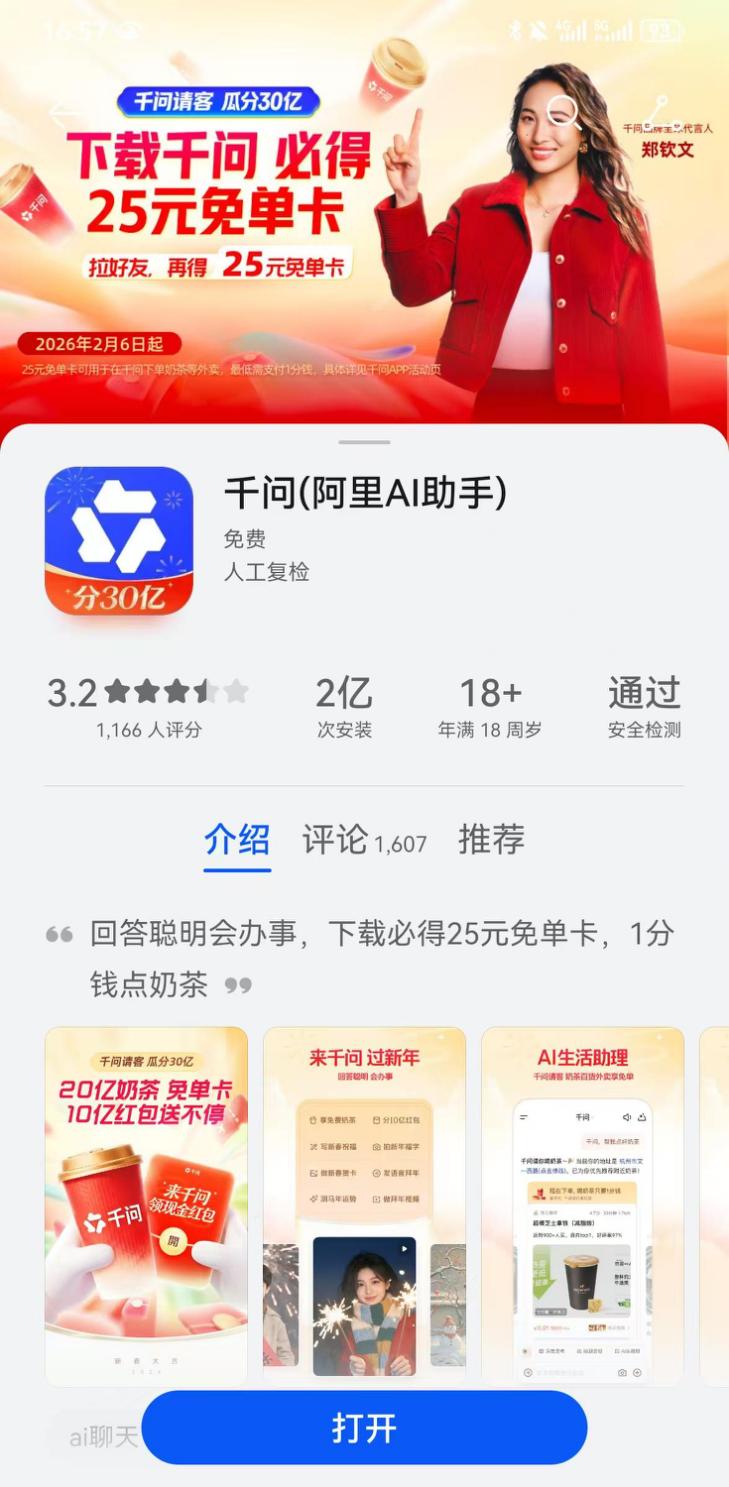 节前,AI应用的C端推广进入集中兑现期,千问App(以下称千问)的春节营销是迄今投入最大的一笔。阿里的30亿元补贴金额,超过了腾讯元宝(10亿元)与抖音(预估15-20亿元)的春节营销预算总和。