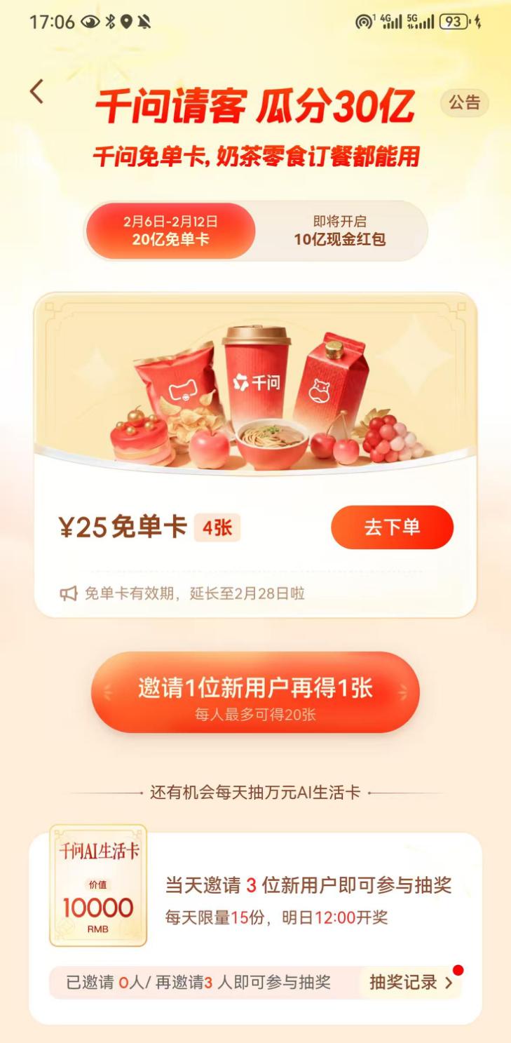 2月6日,千问上线“春节请客计划”,覆盖奶茶、电影票、机票等本地生活场景。活动采用“赠一得一”裂变机制:用户获得免单资格后,每邀请一位新用户注册,双方各得额外免单额度。