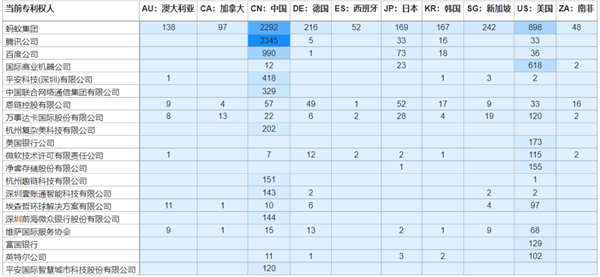 蚂蚁集团专利授权量全球排名第一,且布局最为广泛,中国授权2292件、美国授权898件、新加坡授权242件、德国授权216件、日本授权169件、韩国授权167件、澳大利亚授权138件、加拿大授权97件。腾讯公司已获得授权的专利中,中国授权3345件、美国授权33件、日本授权33件、韩国授权16件、德国授权5件。百度公司已获得授权的专利中,中国授权990件、日本授权73件、美国授权36件、韩国授权18件、德国授权1件。IBM已获得授权的专利中,美国授权618件、日本授权23件、中国授权12件。英国恩链、美国微软、美国万事达、爱尔兰埃森哲、美国维萨等国外企业,虽然专利授权量不高,但全球布局较为广泛。