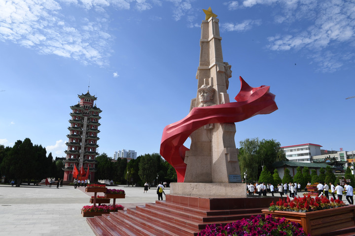 这是2019年7月22日在甘肃会宁县红军会宁会师旧址拍摄的雕塑和会师纪念塔。新华社记者 马宁 摄