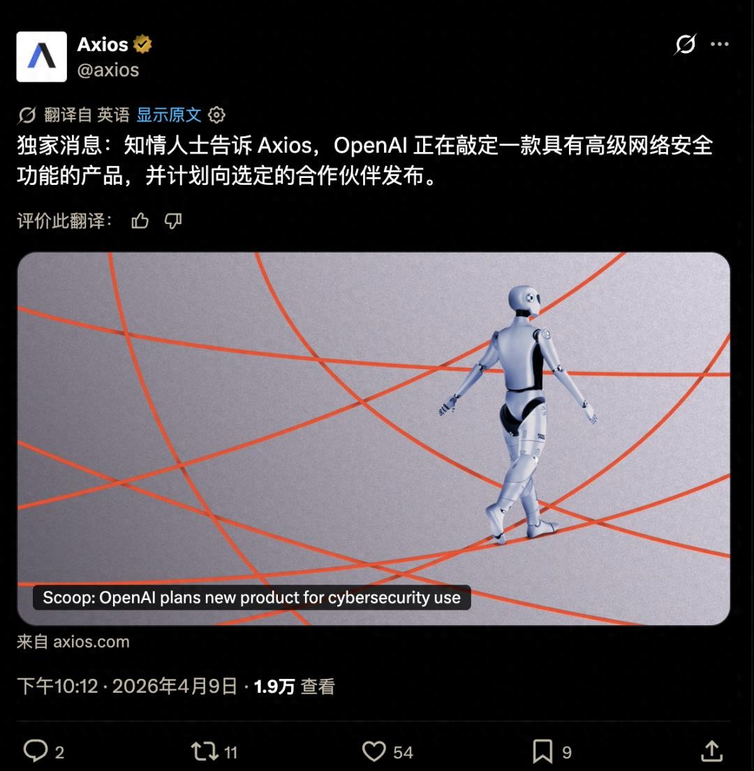 4 月 9 日,Axios 爆料:OpenAI 正在准备一款具备很强网络安全能力的产品,只会先给少量合作伙伴开放。