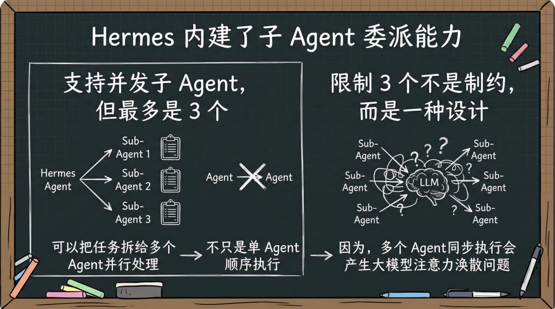 Hermes 内建了子 Agent 委派能力,而且支持并发子 Agent,但最多是 3 个。