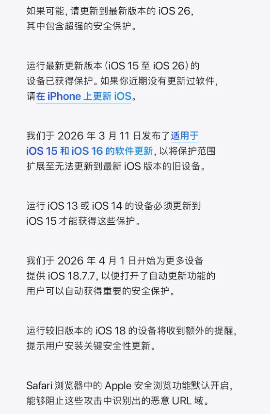 如果用户的iPhone运行的是较旧版本的iOS,请立即更新以保护数据安全。