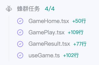 基于H5应用创建功能,我使用其生成了手指反应速度测试的小游戏。妙悟直接开启了蜂群任务模式,4个任务同步并行。
