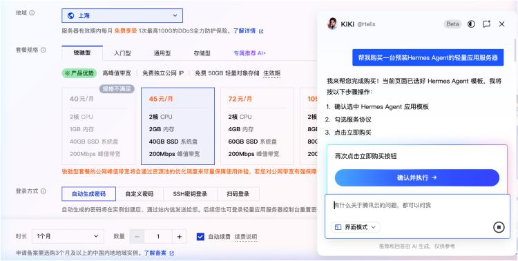 新用户可直接创建服务器实例并选择Hermes Agent镜像,推荐配置2核4G及以上规格;已有Lighthouse实例的用户,可通过重装系统一键切换至该应用模板;开发者也可通过腾讯云内置AI助手KiKi,以语音或文字指令完成全流程安装。