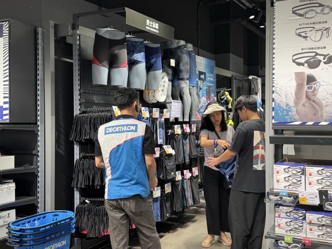 8月8日午间,记者来到迪卡侬猎德店注意到,即便是工作日,也有不少市民前来采购球拍、泳衣和山地车等运动器材,其中不乏正在放暑假的学生群体。