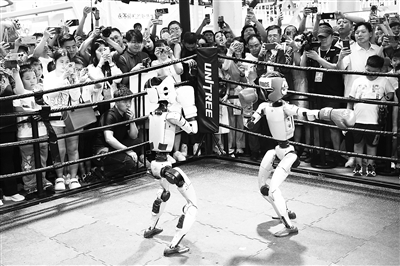 图为杭州宇树科技有限公司的人形机器人为观众上演拳击表演。记者 洪星摄