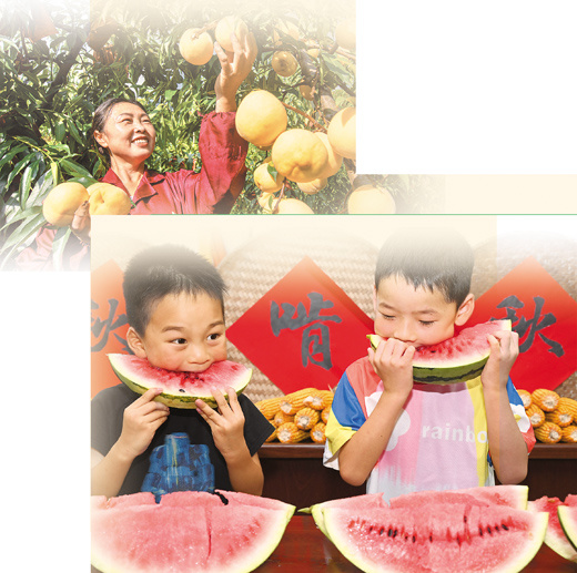 上图:立秋时节,贵州省黔西市洪水镇官庄村丰月谷水果种植基地的黄桃迎来丰收,村民们忙着采摘。史开心摄(人民视觉) 下图:8月7日,在四川省内江市东兴区郭北镇黄泥村,小朋友在吃西瓜“啃秋”。兰自涛摄(人民视觉)