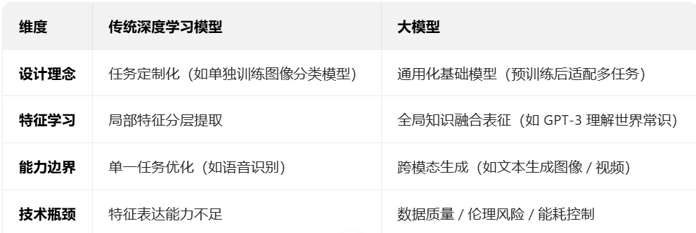 进一步分析大模型作为深度学习规模化发展的阶段性成果,及其与传统模型的技术分野。