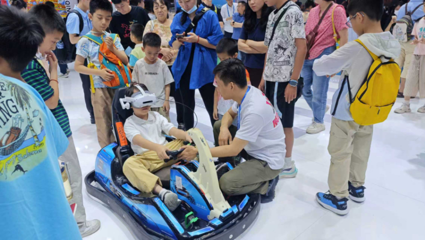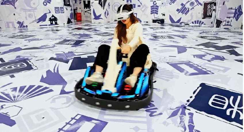 在传统卡丁车的基础上,戴上头显“跑酷”,穿上体感背心,通过振动感受“中弹”,一键“穿越”到不同的虚拟赛道,同时还能实现多人在线竞技。车机与游戏引擎深度融合,能实现精准的震动控制,模拟各类路况,同时模拟各类受击体感。