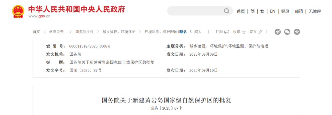 国务院关于新建黄岩岛国家级自然保护区的批复