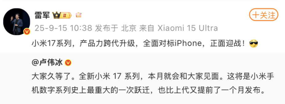此外,卢伟冰透露,过去5年,小米研发投入超过1000亿人民币,未来5年投入将加码到2000亿人民币。此次发布会还将给手机带来点不一样的“新东西”。 值得注意的是,卢伟冰发布该博文时,显示本人已用上Xiaomi17ProMax手机。 8月28日,小米正式发布小米澎湃OS3。这是小米首次为澎湃OS举办独立的发布会。据悉,在跨生态互联方面,澎湃OS3实现了苹果设备和小米生态的操作打通。同日,小米集团创始人、董事长兼CEO雷军在社交平台发文称:“苹果用户可以仔细看看:小米手机更好兼容苹果生态。” 北京时间9月10日凌晨,苹果公司以“前方超燃”为主题举办了2025年秋季发布会,正式推出了iPhone17系列新品。12日,iPhone17系列开启预售。