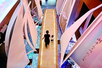 游客在浙江嘉兴芦席汇历史街区“大运河数字诗路e站”体验互动景观。新华社发