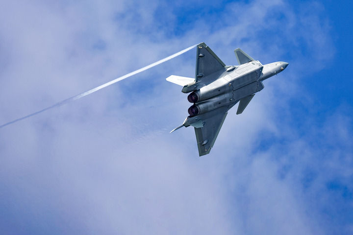 ↑9月19日,歼-20进行飞行表演。新华社发(谭巳成 摄)