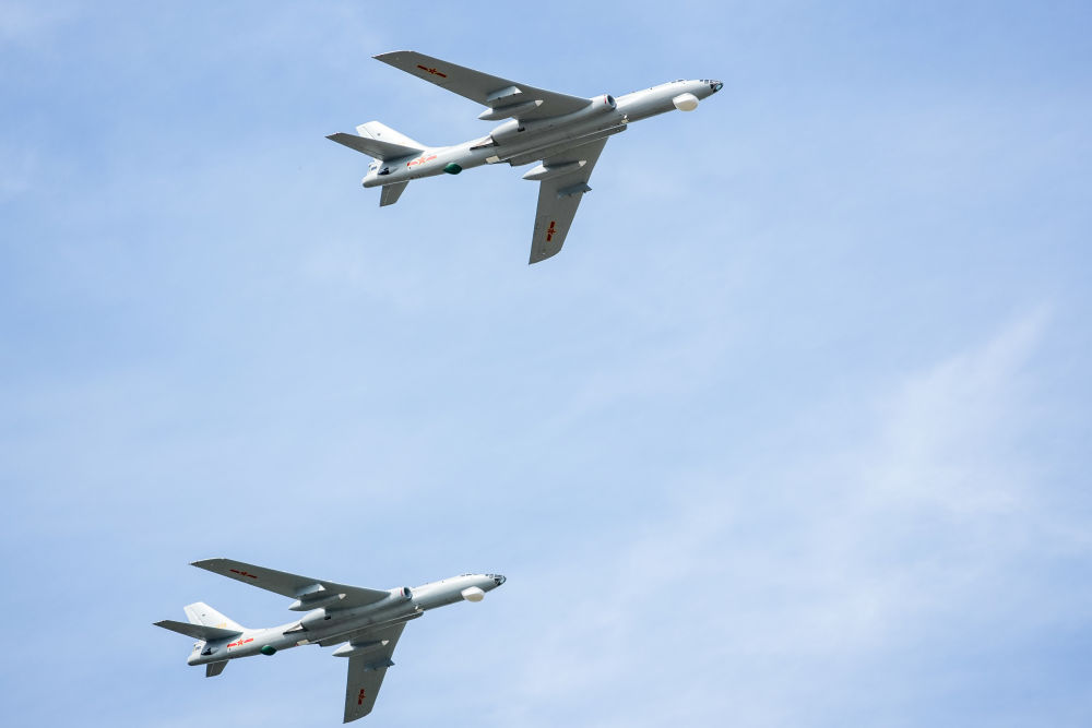 ↑9月19日,轰-6双机编队进行飞行展示。新华社记者 张楠 摄