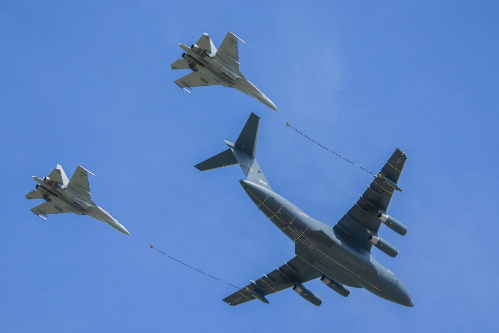 ↑9月19日,运油-20A和歼-16编队通场。新华社记者 颜麟蕴 摄