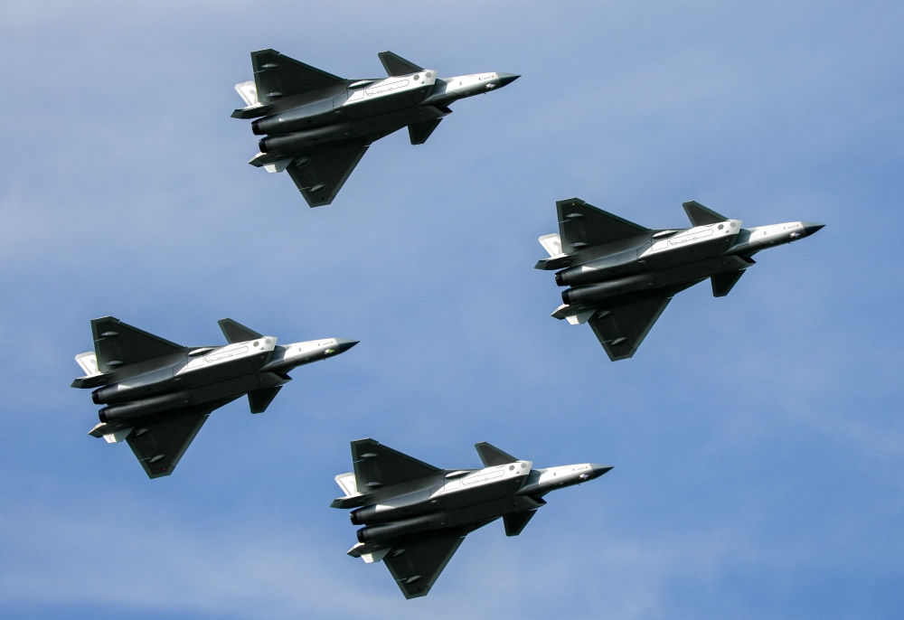 ↑9月19日,歼-20四机编队进行机动飞行展示。新华社记者 颜麟蕴 摄