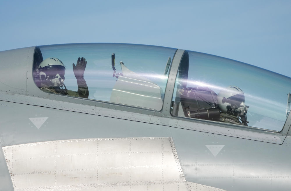 ↑9月19日,歼-16飞行员在完成表演后向观众挥手致意。新华社记者 颜麟蕴 摄
