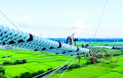 在安徽省芜湖市,安徽送变电工程有限公司施工人员在高空进行甘浙特高压工程安徽段架线施工。新华社发