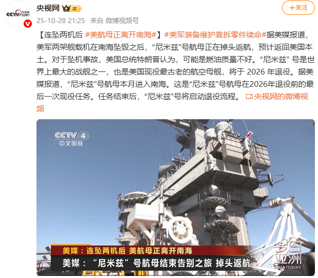 据央视网微博消息,据美媒报道,美军两架舰载机在南海坠毁之后,“尼米兹”号航母正在掉头返航,预计返回美国本土。