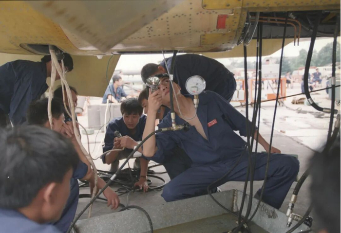 歼-10项目机务大队机务张凤贵(右一)在歼-10研制现场