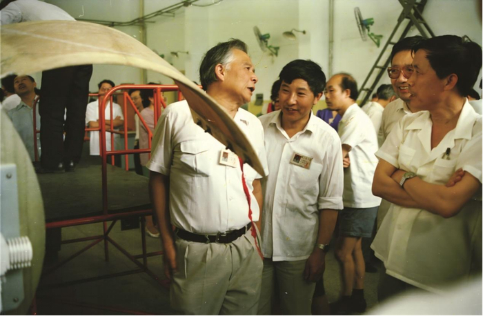 歼-10飞机总设计师宋文骢(左一)、时任成飞总经理侯建武(右一)等人在研制现场交流