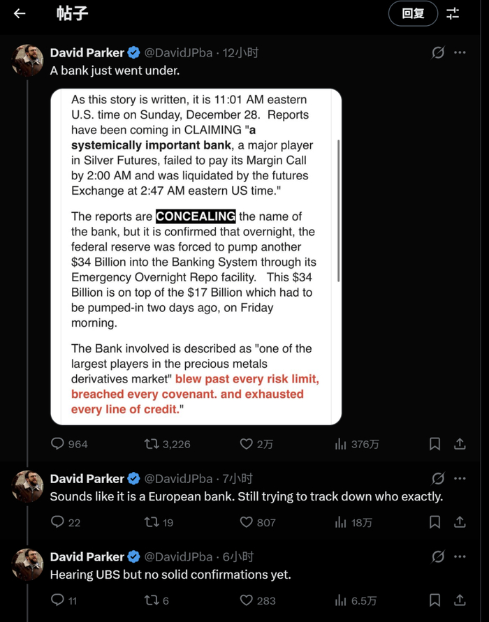 行情剧烈波动之际,社交平台上流传的一则关于“系统重要性银行”因白银期货空头头寸爆仓的传闻引发市场广泛关注。