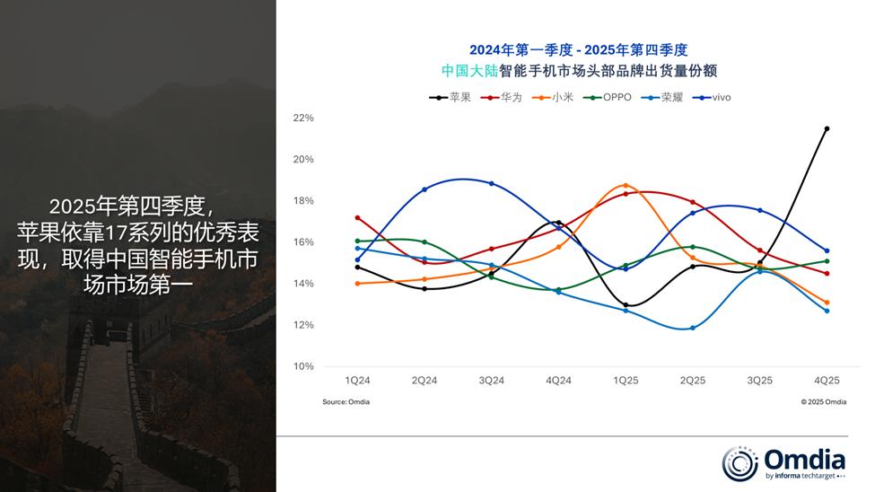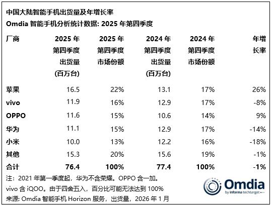 2025 年第四季度,得益于年末促销及国补政策的延续,大盘跌幅有所收窄,中国大陆智能手机市场四季度同比下降 1%,出货 7640 万台。