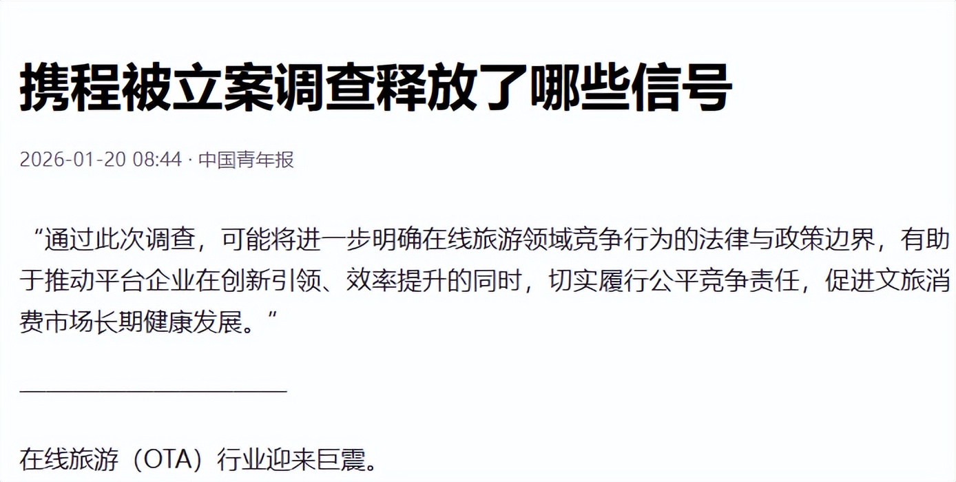 2026年1月14日,国家市场监督管理总局依据《中华人民共和国反垄断法》,正式对携程立案调查,调查范围明确聚焦在线酒店预订平台服务市场。这个消息一出,不仅携程的股价应声波动,整个在线旅游行业都感受到了震动——这标志着我国对平台经济的反垄断监管,已经从电商、外卖等综合领域,延伸到了在线旅游这样的垂直细分赛道。