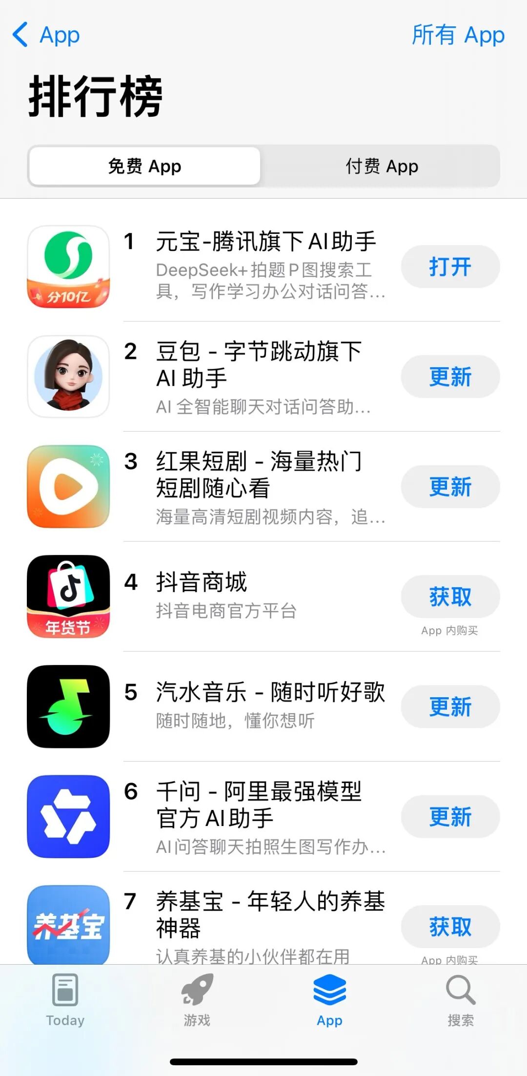 至少从首日表现来看,元宝算是不负众望,首战告捷了。八姐看了下,元宝自昨日下午开始,就在AppStore的免费榜上排名第一了,超过了长期排名老大的“豆包”。要知道“豆包”在苹果商店排行榜的地位那可是堪称稳固,即便是当时快手发生了直播重大事故,一堆吃瓜群众去围观下载,快手也只排名第二,位于豆包之后。现在,元宝一发红包,排名就超过了豆包。