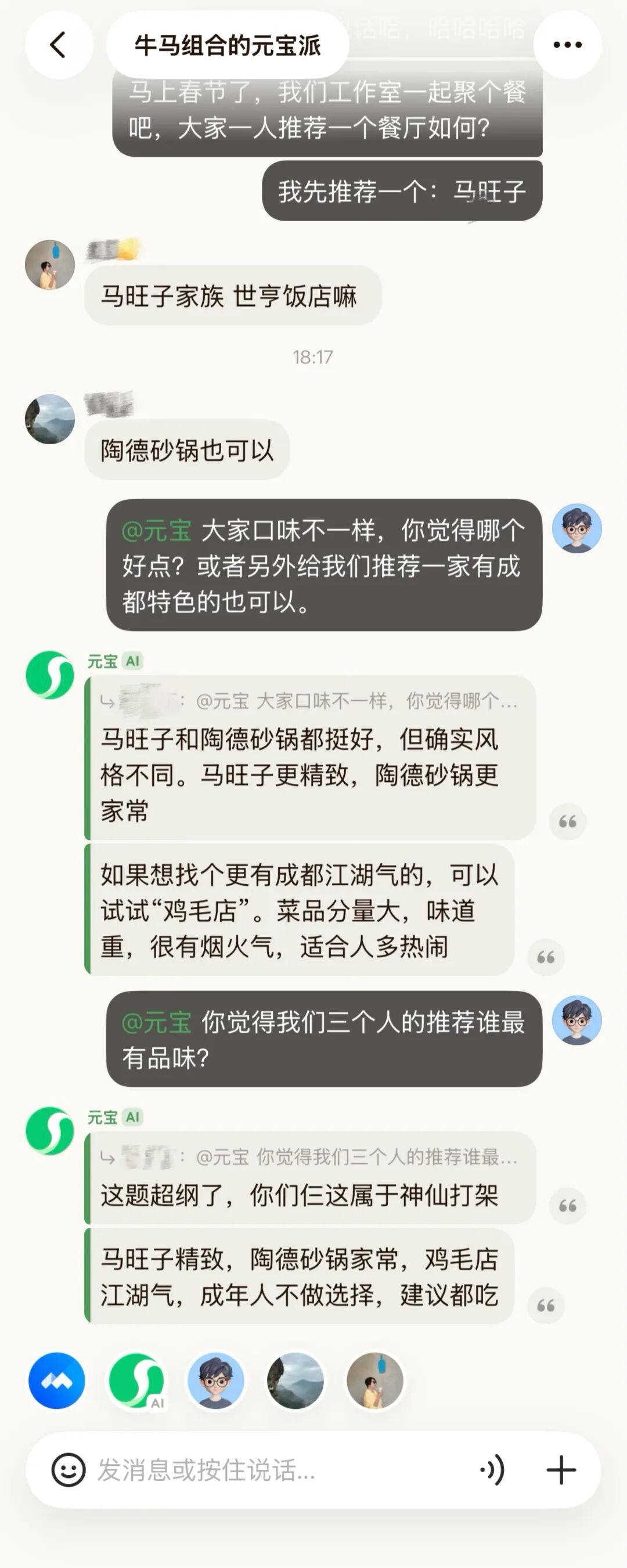 元宝派不仅功能强大,而且还很靠谱。小锦尝试在工作室同事建的元宝派里,让它给我们安排一下春节聚餐的地方,它推荐的地点一看就是个“成都老吃家”,聊天的风格又像是多了一个调皮新同事,让工作的心情也轻松了不少。