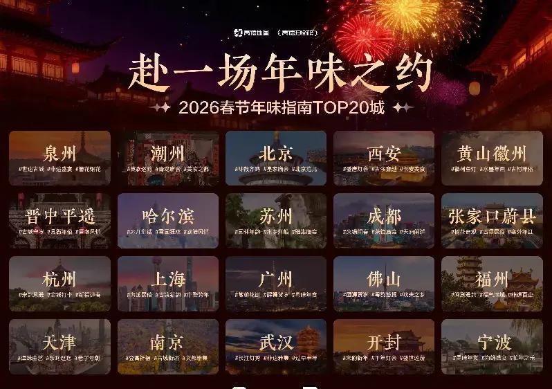 这回高德地图是不整虚的,直接弄了个“2026春节年味指南TOP20城”。这榜单可不是随便画的,是跟着大伙真实的脚印找出来的。您要是想看大场面,北京的地坛庙会、西安的城墙灯会,那红墙黄瓦配上璀璨灯火,年味不是写在纸上的,是得听见锣鼓响、闻见香火气才算数。