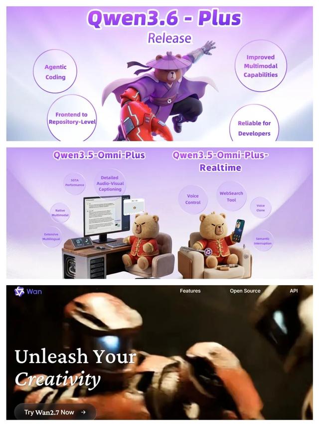 《节点AI》发现,就在这两次变阵之间,通义实验室在四天内密集发布了三款旗舰模型:Qwen3.5-Omni全模态交互模型、Wan2.7-Image视觉生成模型、Qwen3.6-Plus大语言模型,覆盖全模态理解、图像生成与编程智能体三大关键能力区间。
