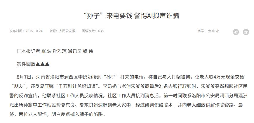 人民公安报《“孙子”来电要钱 警惕AI拟声诈骗》