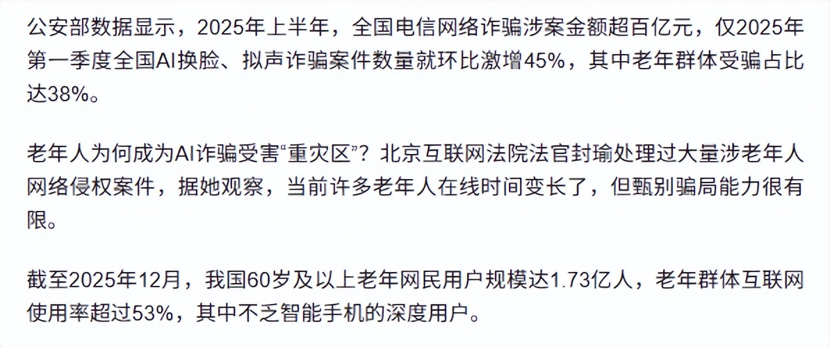 骗子就这样巧妙的利用了老人对数字时代的钝感,和对后辈的疼爱,让他们辛苦积攒的金钱一夜蒸发,在公安部的数据中显示,我国2025年第一季度的AI换脸诈骗案增加了45%,其中38%的受害者都是老年群体,而且成功率几乎高达90%以上!