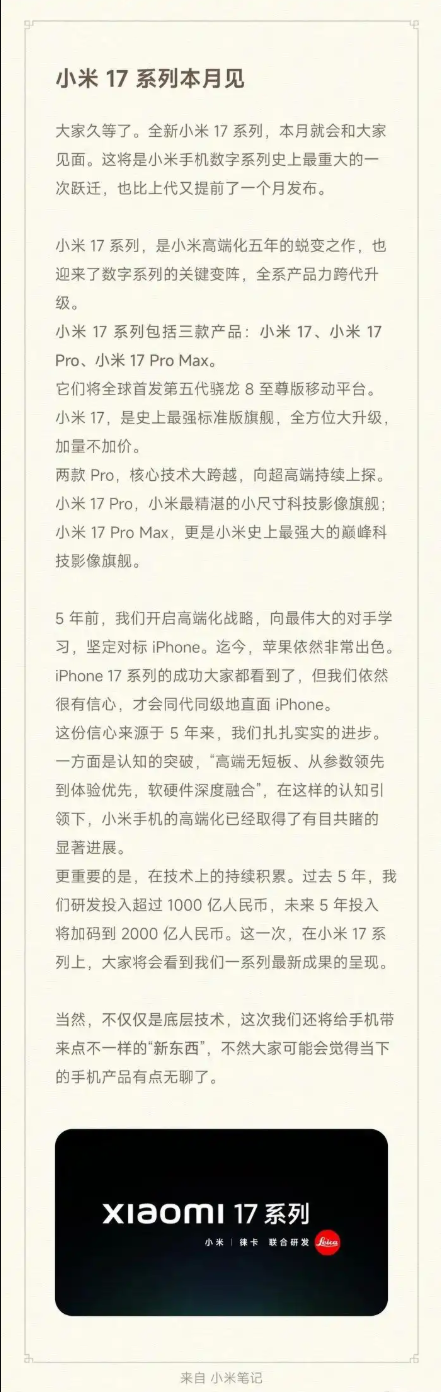 小米17官宣本月发布:含小米17、17 Pro、17 Pro Max三款机型,卢伟冰称"有信心直面iPhone 17"