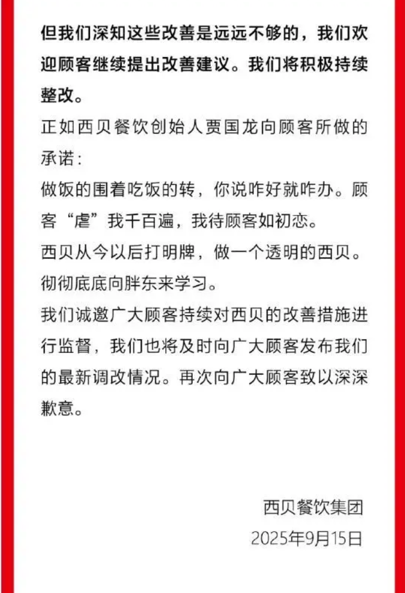 “顾客虐我千百遍,我待顾客如初恋。西贝从今以后打明牌,做一个透明的西贝。彻彻底底向胖东来学习。我们诚邀广大顾客持续对西贝的改善措施进行监督,我们也将及时向广大顾客发布我们的最新调改情况。再次向广大顾客致以深深的歉意。”