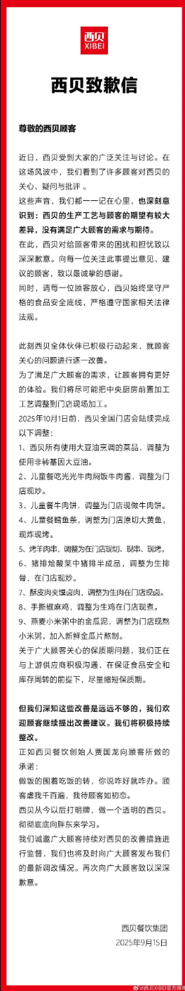 9月15日中午,西贝餐饮集团就近期预制菜争议道歉。