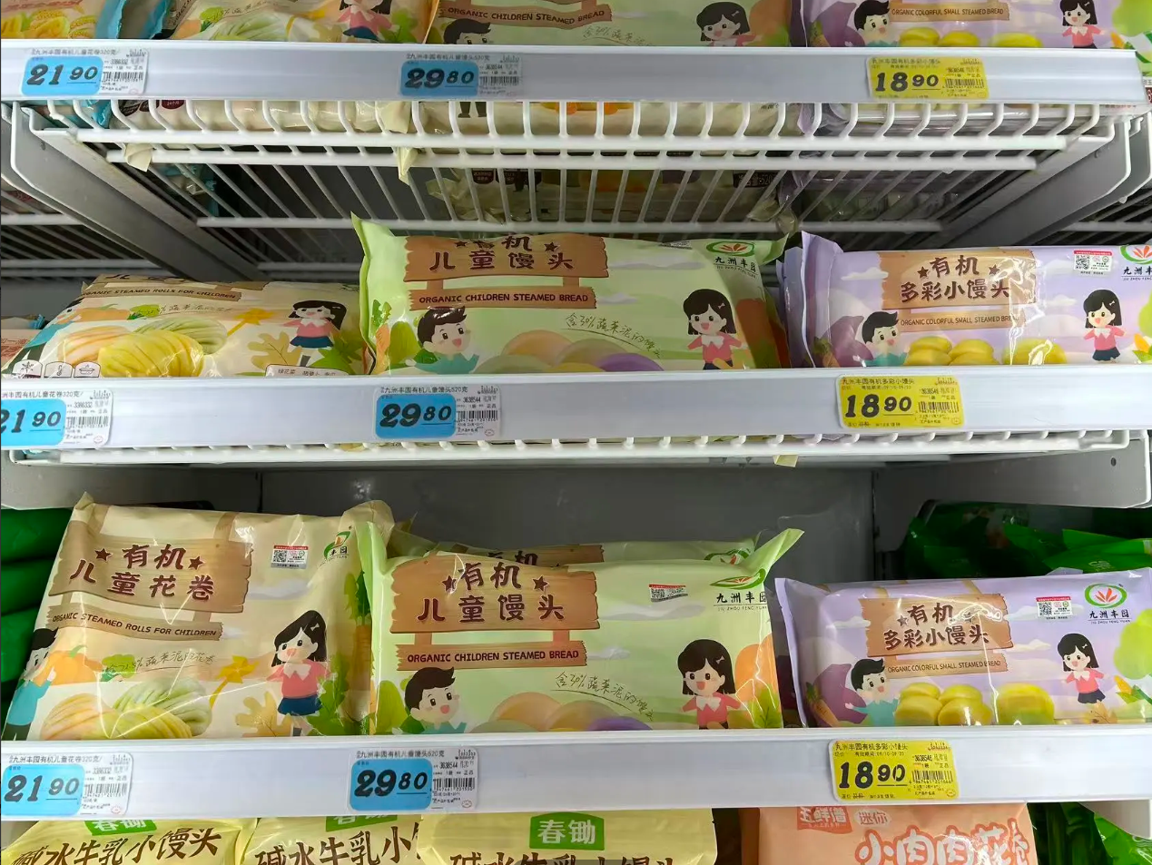 9月17日,界面新闻走访上海静安区的两家大润发与盒马鲜生,在其中并未找到来自上述企业的烧烤与速冻肉制品,但看到“九洲丰园”的儿童速冻面点与有机速冻蔬菜在售,保质期24个月。“九洲丰园”官方旗舰店内,销量最高的正是它的有机儿童点心。